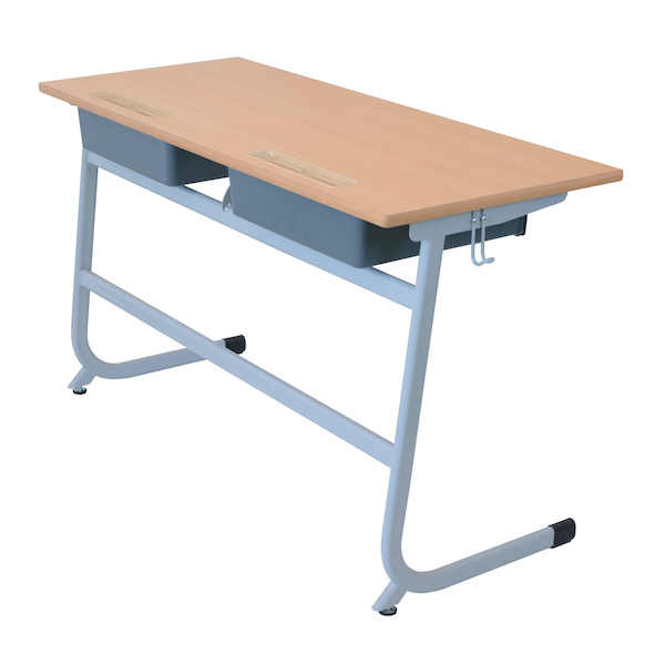 Banca scoala pentru doi elevi. Blat din HPL canturi din lemn masiv, suport profesional din plastic pentru rechizite, structura metalica integral sudata pentru o rezistenta sporita.