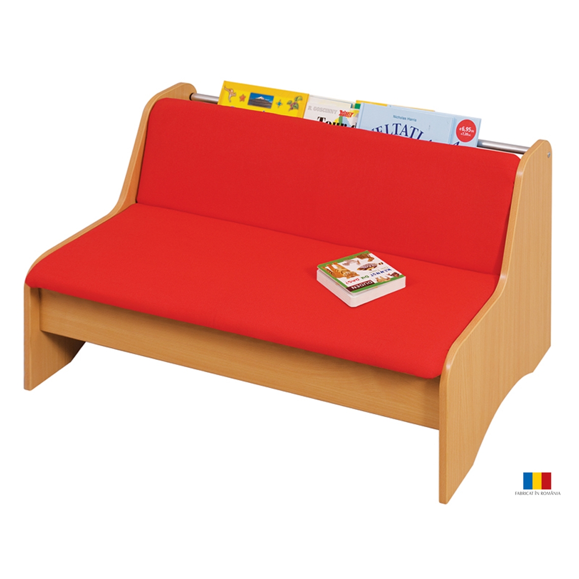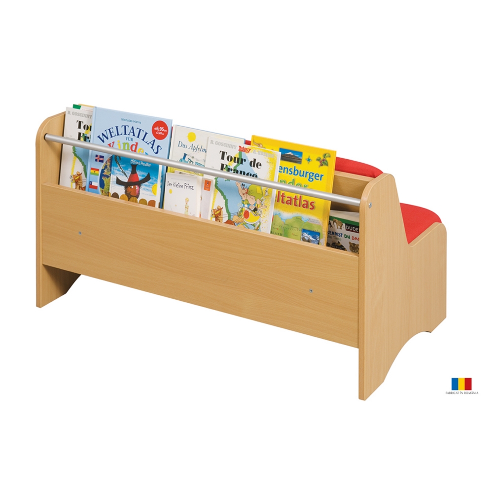 Mobilier copii destinat salilor de grupa sau colturilor de lectura. Banca de lectura beneficiaza de un spatiu de depozitare pentru carti si reviste. De asemenea exista o bara metalica cu diametrul de 18 mm cu dublu rol : atat pentru sustinerea cartilor cat si pentru o mai buna rigidizare a bancii