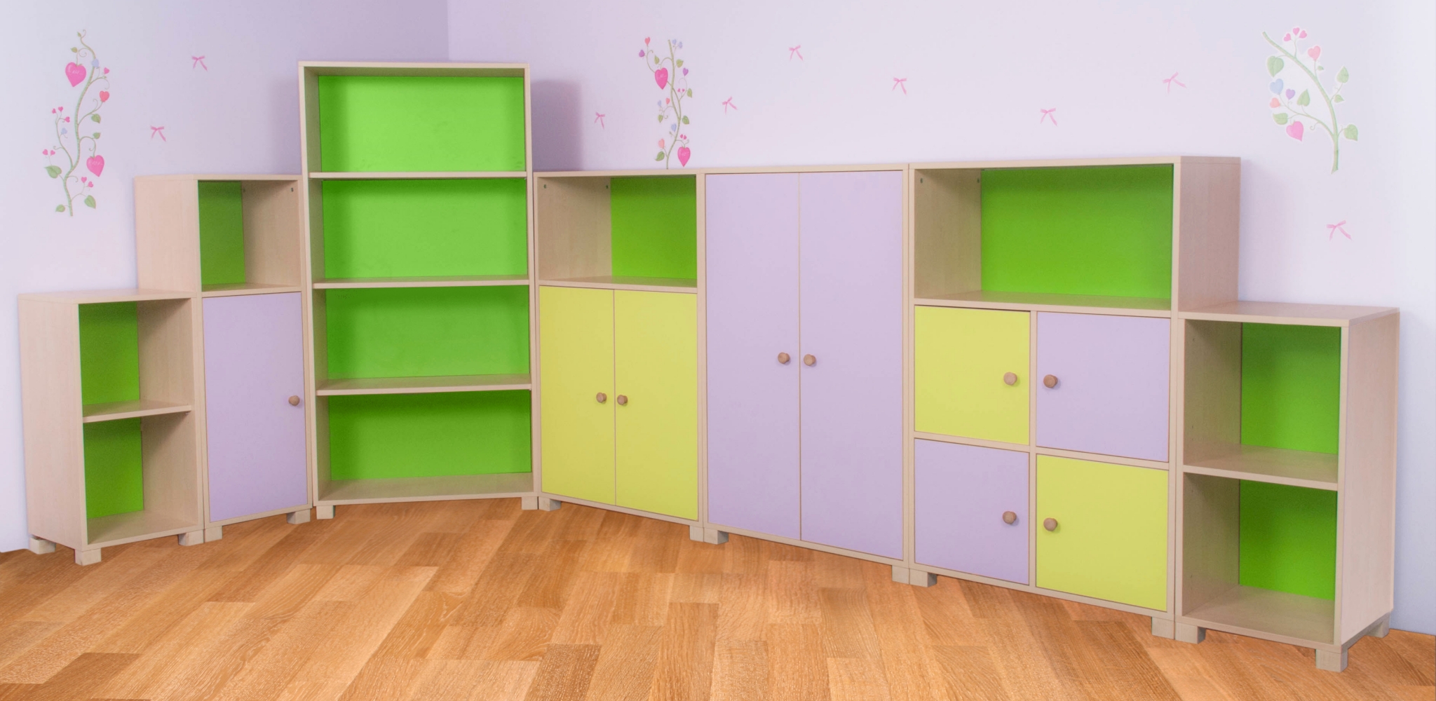Dulapuri modulare pentru gradinita, cu spatii flexibile pentru depozitare ,permitand cele mai variate compozitii in sala de grupa. Mobilier modular copii cu dulapuri depozitare din pal melaminat 18 mm grosime, canturile protejate cu ABS, picioare cu inaltimea de 50 mm , feronerie de calitate superioara. Ca o nota distinctiva, spatele dulapurilor este confectionat din mdf alb. Culorile sunt pastelate iar atmosfera din sala de grupa devine prietenoasa si calda. Dulapurile se cupleaza unul de altul pentru a forma configuratia dorita.
