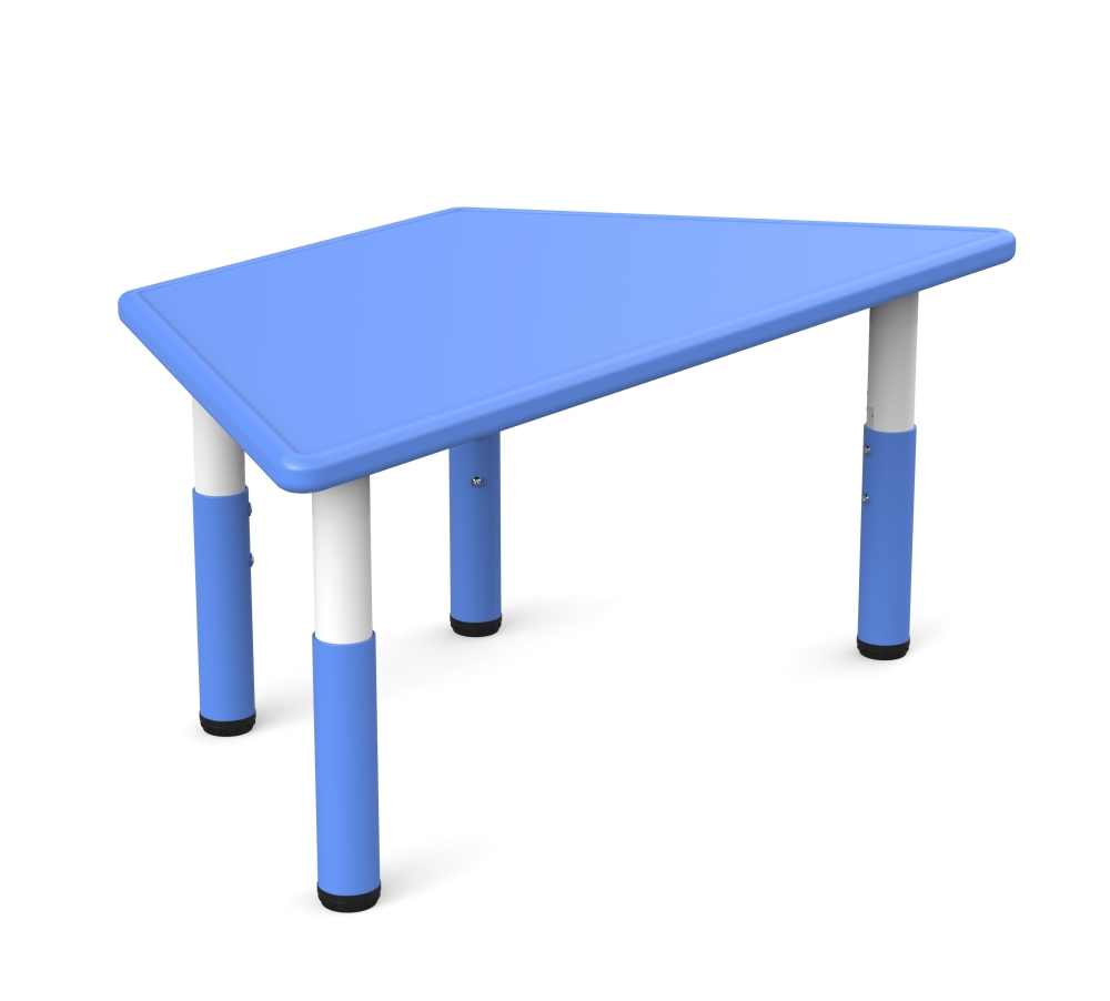 Masa trapezoidala reglabila, din plastic rezistent, culoare albastra, pentru gradinita. Datorita posibilitatii de reglare a inaltimii pe o cursa de la 480 la 600 mm, masa este pretabila pentru toate grupele de varsta.